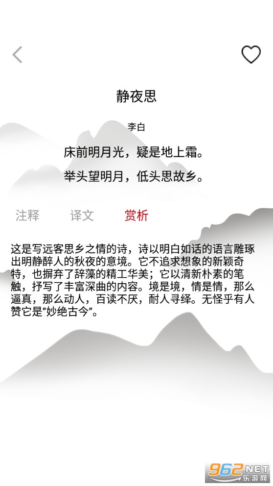 古文赏析大全APP是一款唐古诗词学习阅读app,收录诗人77家,共311首,包含解释、赏析等信息,为诗词爱好学着提供方便!独特的水墨设计风格,汇集唐,宋,元,明,清各朝代诗人,学古今成语,领略古今文化。