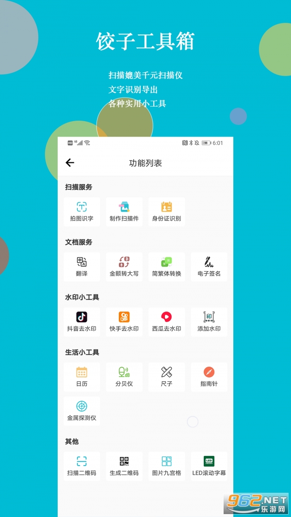 《饺子工具箱最新版》是一款超级好用的多合一效率手机工具,能够为用户提供丰富的功能,包括二维码工具,文本识别,水印工具等等,为你提供拍图识字,制作扫描件,身份证识别,翻译,电子签名,日历,去水印等等服务,让自己的学习和工作更轻松!