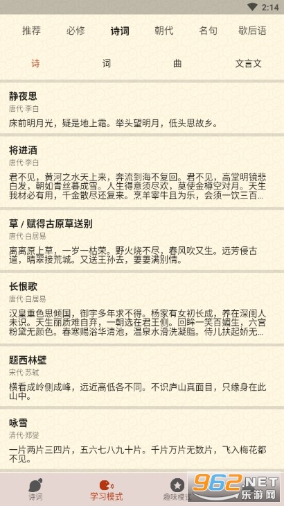 《古诗文学》是一款非常好用的古诗词学习平台,收录了十几万的古诗词,绝对称得上是文化退化症的古诗词软件,帮助大家学习古诗词弘扬中华文化,全方位的古诗词注释讲解,逐词逐句的解释,还有关于诗词中的典故,作者著作时的意境心情等等,都会详细的为用户们呈现。