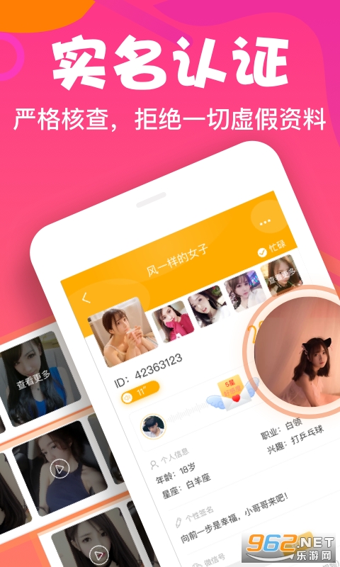 一款交友软件,为恋爱、聊天、视频、娱乐、交友提供了平台。使用视频聊天,拒绝冷冰冰的文字形式,同时还能够提高聊天的效率,让聊天更加畅通无阻,可以看到对方的表情变化,更是直男和直女的聊天福利,可以明确的根据表情的变化,掌握话语的隐藏含义,从而提高交流的能里以及反应的能力,提高个人的情商;通过了实名认证的方式,严格的核查流程,让聊天更放心,拒绝一切的虚假资料;随时随地为你速配交友,拿出手机就能够为你匹配陌生人;精准推荐,根据你的喜好快速推荐。