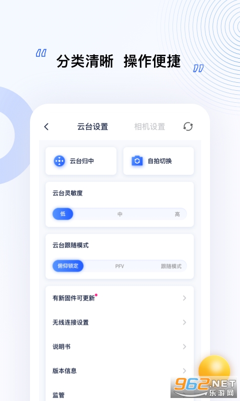 3、支持相机/云台设置、作品编辑、作品传输等功能,一键连接,随时查看拍摄作品,快速编辑,一键分享好友,让拍摄更清晰。