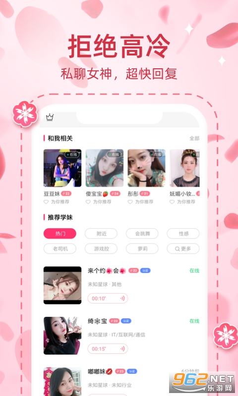 《桃缘交友APP》是一款非常给力的美女聊天交友软件,这里为用户提供最好最棒的美女交友插件,不需要任何的费用,操作也简单,超多美女帅哥资源等你来撩,感兴趣的朋友还在等什么?欢迎来962下载体验试试吧!你一定会爱上这款脱单神器的!