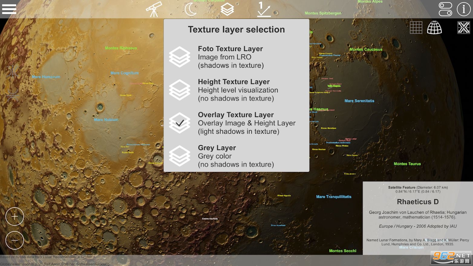 有四种可用的地图模式(高程显示,照片插图,两者的结合以及望远镜模式的灰色纹理)。这些视图是根据NASA的“月球侦察轨道器”的数据创建的。此外,还从显示的高程数据中获取了表面细节(法线贴图),可以将其与所有贴图模式结合使用。在地图上甚至可以看到最小的火山口,高程,沟壑和峡谷。