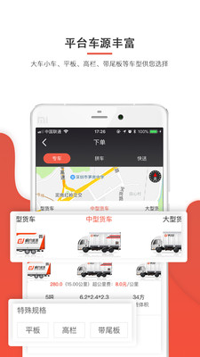 平台车源丰富,大车小车、平板、高栏、带尾板等车型供您选择。