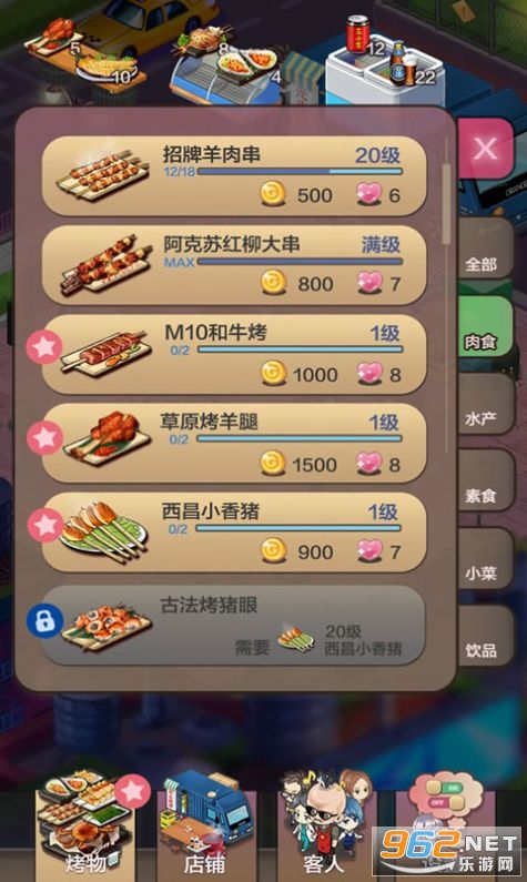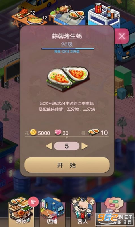 3、升级店铺,雇佣传说中的食神,小当家来炒菜,地摊食物诱人。