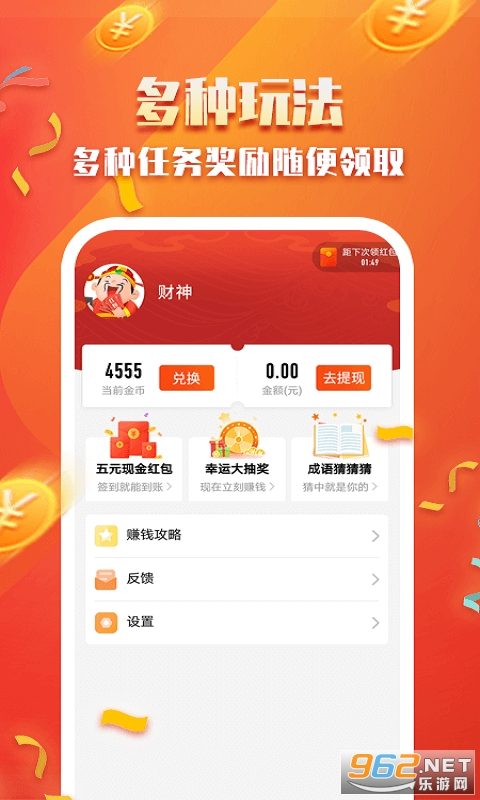 新用户首次登陆立即赠送1000金币奖励,首页内每天还可以免费领取金币,金币可兑换红包,立即入账。