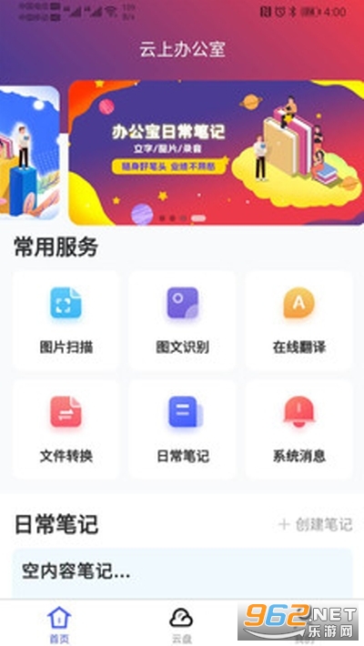主要功能有照相和图片扫描,通过手机拍照将文件轻松制成扫描件;文件类型互相转換,PDF和Word等文件互相转化再也不用发愁;云盘存储文件方便快捷,随传随存,随存随用;还可以扫描照片识别文字。此外还提供了文字翻译功能,并且添加了事件提醒,可以随手添加图片笔记,提高工作效率。适用于各种办公人群。