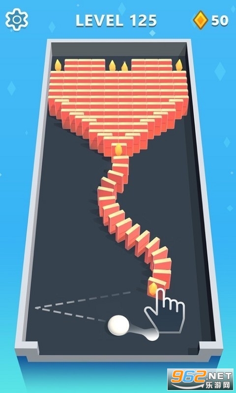 通过发射小球击倒多米诺骨牌,每局游戏只能发射一次小球,如果能击倒所有的多米诺骨牌,则游戏通关。