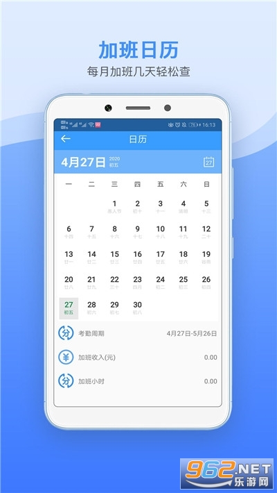 一键设置底薪、月基础工时数,每天日历记录工时,即可自动计算当月工资和加班收入。
