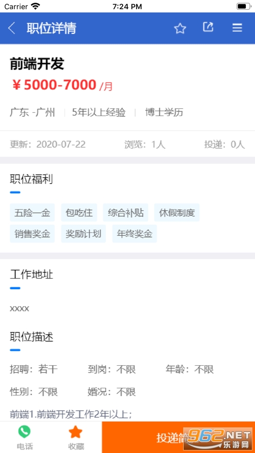 3、喜欢的工作可点击收藏,投递简历,收藏列表即可查阅。