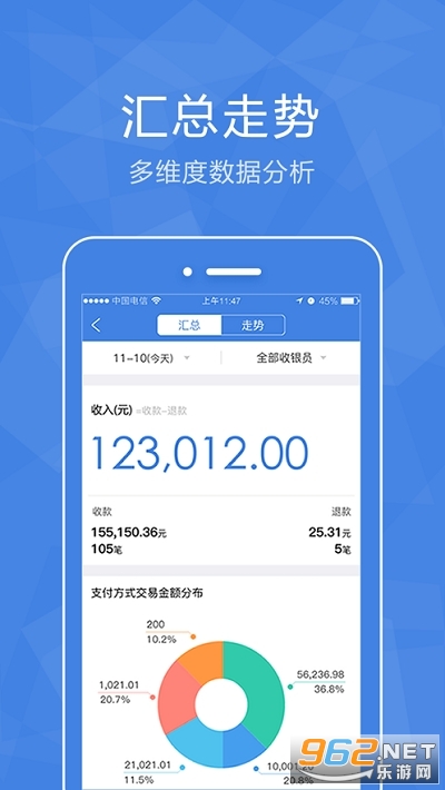 4、实现资金归集。如果商户拥有多个店面,“乐收银”更能将货款实时归集到商户指定的个人结算账户中,帮助商户对多家分店的资金进行统一规划;