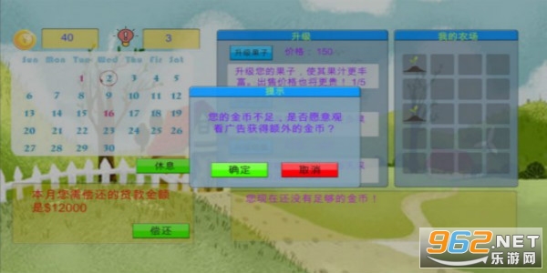 在农场人生手游您只能通过不停的勤劳劳动,售卖水果获得的收益,在月底之前偿还一定额度的欠款!