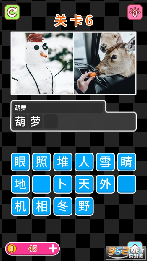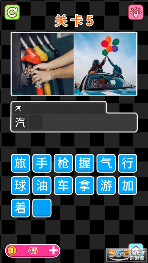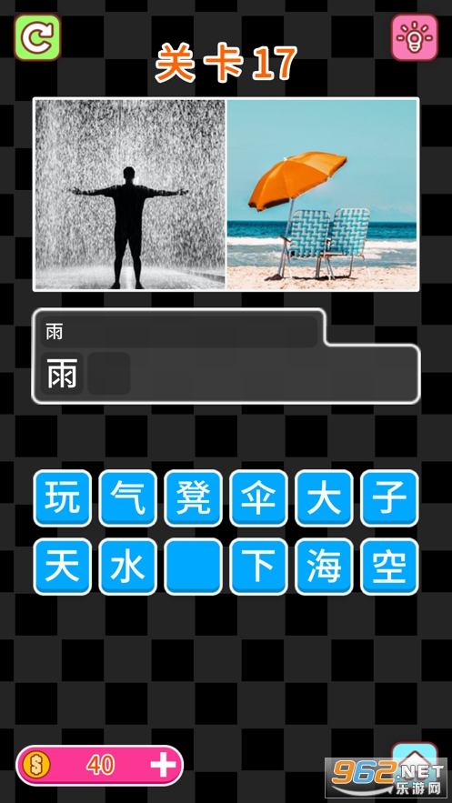 这是一个通过两张给出图片猜出正确的词的游戏,也就是看图猜词。在这个游戏中,你需要根据两张图片的内容猜出正确的词来完成关卡,每一关有两张图片,你必须选择文字并按顺序拼出正确的答案,所有的谜题都会挑战你的大脑。