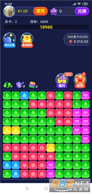 欢乐消星星-是一款类似于爱上消水果的消除类赚钱APP,每过一关都有现金红包,获得分红星还能享受平台永久分红。欢乐消星星红包版下载安装就有新人红包,玩法十分简单,点击即可消除相邻色块,每过一关均能获得红包奖励,刚开始的时候红包金额较大,后期会变低,每天可领36次红包,只要你用心去玩,每天都能提现。