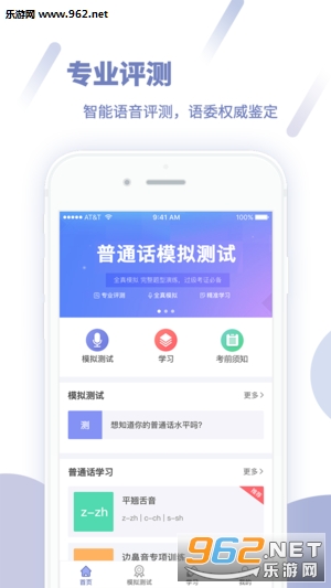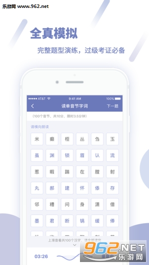 依据国家《普通话水平测试实施纲要》进行普通话模拟测试,与国家普通话水平智能测试流程高度一致,单音节字词、多音节字词、短文朗读、命题说话,面面俱到,让您在全真模拟测试环境中逐步提高普通话水平,轻松过级。