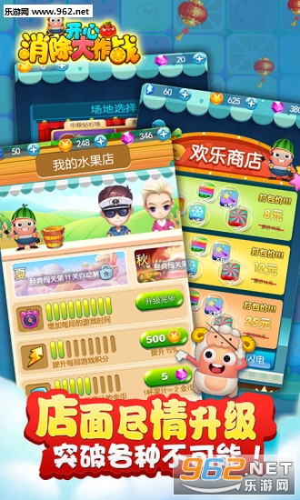《开心消除大作战》是一款以水果为题材的点消合成对战与目标挑战闯关游戏。在游戏中通过不断挑战各种目标来获得各种奖励,在获得奖励后可以购买更多道具让下次挑战变得更容易,由此形成了一个良性循环;还可以通过不断升级水果店来拉伸营业额,降低游戏难度,大大增加了游戏的趣味性和挑战性。