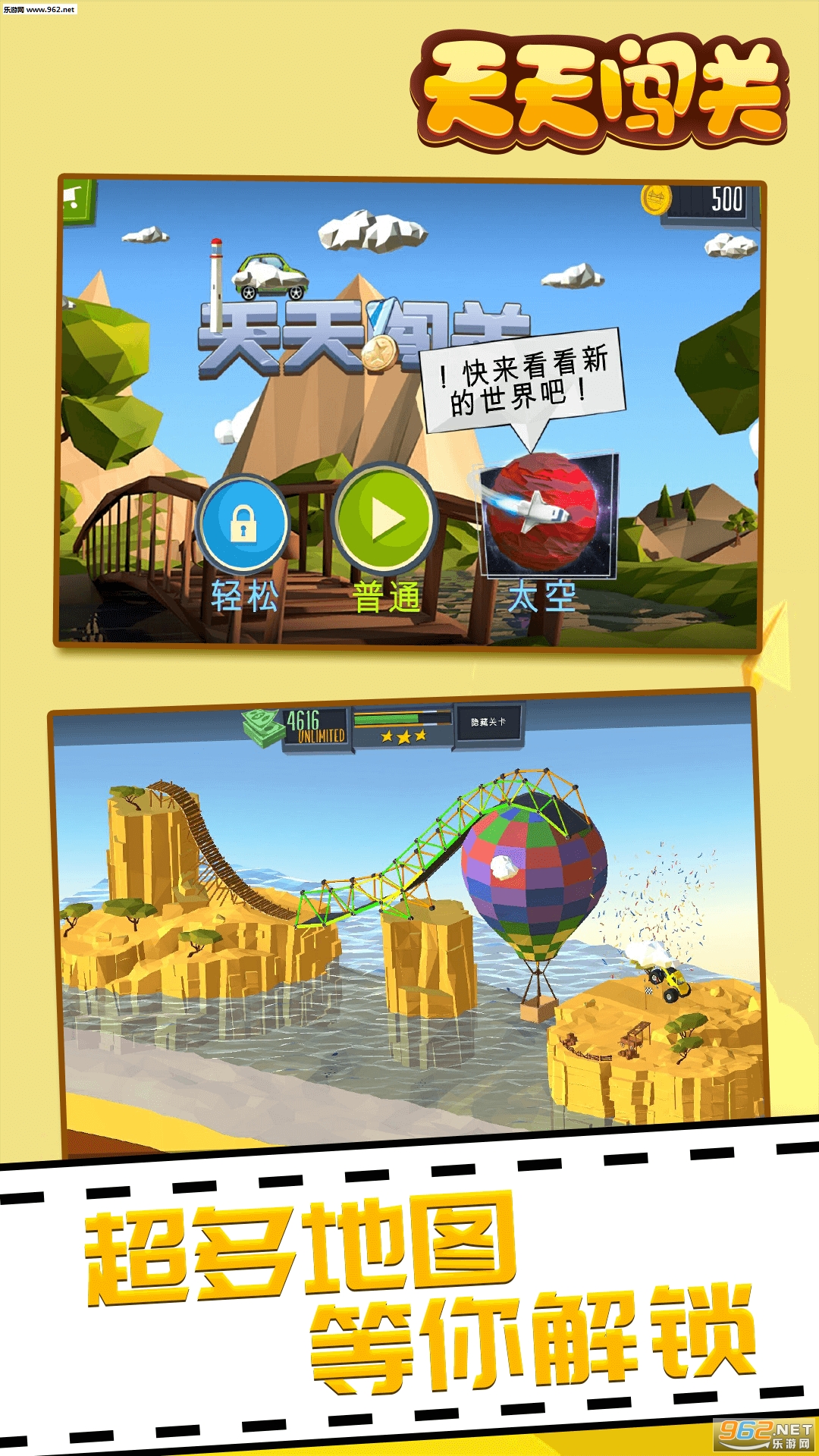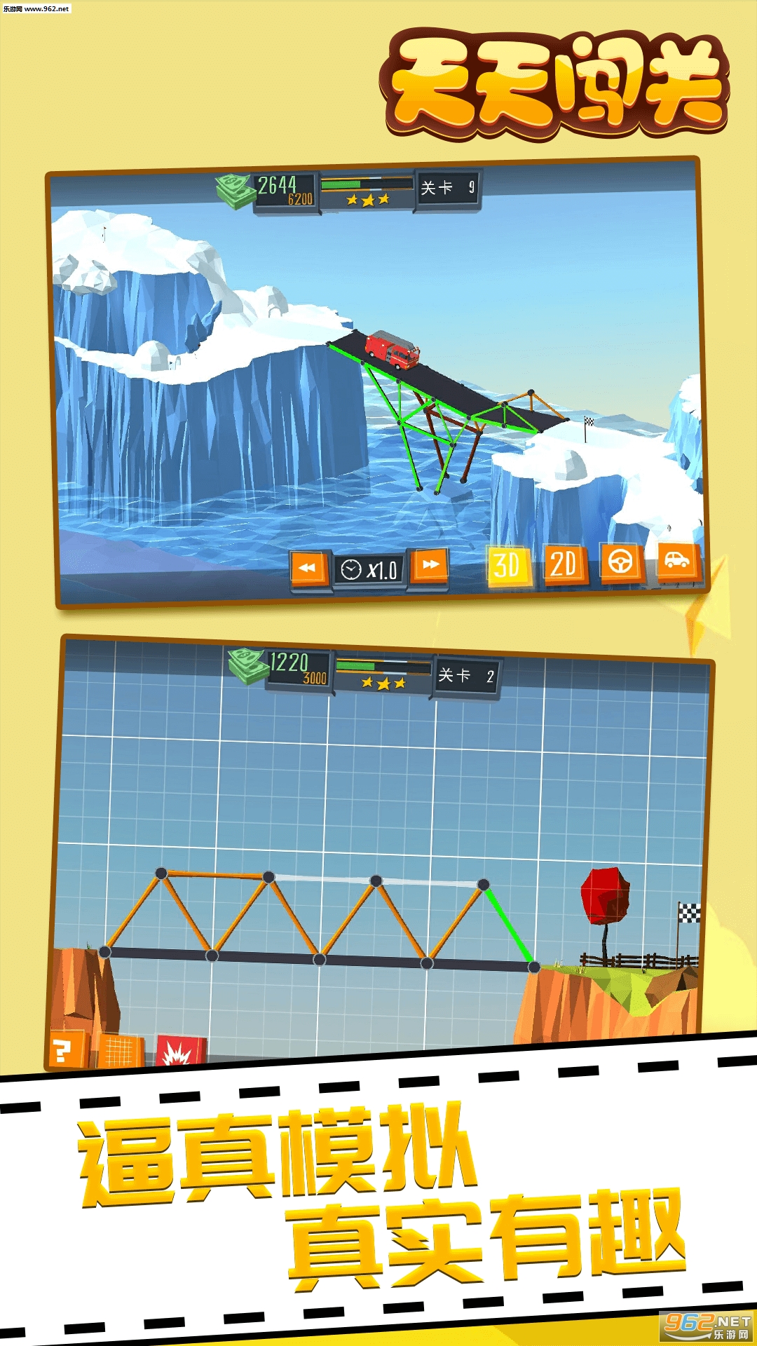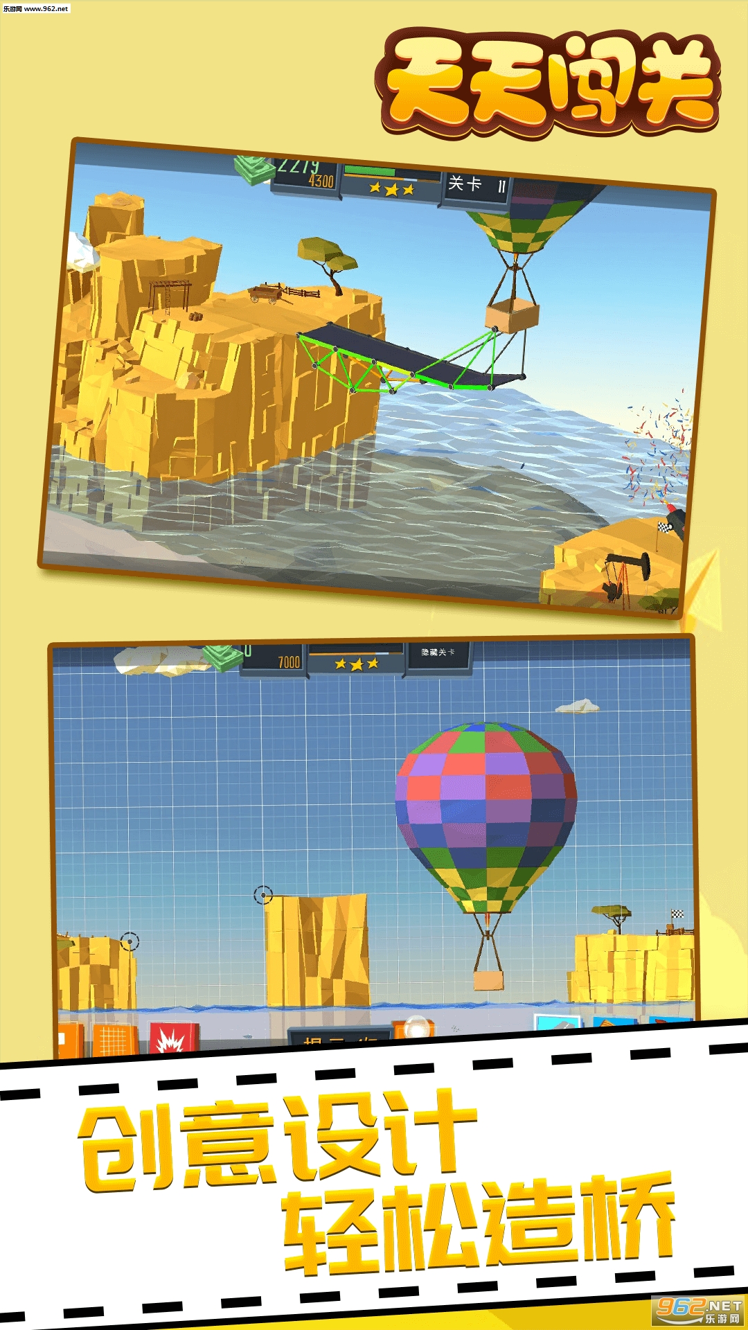 天天闯关是一款益智类解谜游戏。 在游戏中你将成为桥梁设计师和建造师,在不同的条件下为小汽车,卡车等各种车型进行桥梁设计建造,以便他们能顺利过桥。开启你的动脑风暴,开始建造吧!