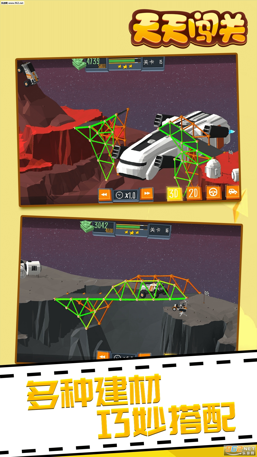 这里有不同的建筑材料——桥面,木头,钢铁,缆线等;另外还要考虑预算限制,任务挑战,如何在预算内利用这些材料建出最合理最坚固能耐的桥梁呢?玩家也可以自由发挥,天马行空的建造出千奇百怪的桥梁,在这一次次的尝试中,找到最合适你的风格吧!
