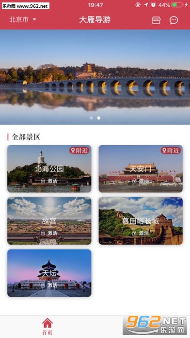 界面简洁美观的智慧导游APP,既可以为用户推荐个性的旅游线路规划,还可以使用景点语音导游,也可以查找功能区、或者购买旅游文创产品,打造一站式的旅游服务!
