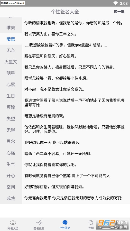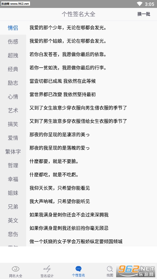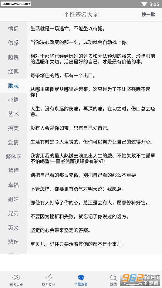 《个性签名大全2026最新版》是一款为朋友们打造的个性签名软件,软件中有着霸气、伤感、哲理、幸福、英文、暗恋等众多不同类型的语句,朋友们可以选择自己喜欢的一个类型进行查看,如果没有喜欢的点击右上角的换一批即可进行刷新看到其他的签名语句。