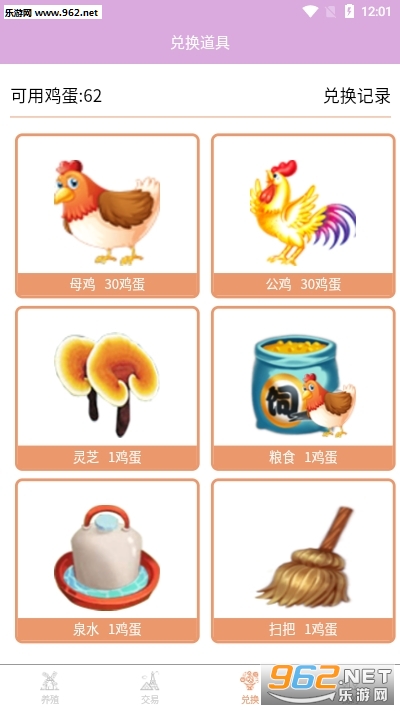 注册送62鸡蛋,去兑换一只公鸡一只母鸡,每天上线收一次鸡蛋10~15颗,一颗鸡蛋1块钱,10个起卖,每天都可以卖,每天到手10块钱 速度领取啦。