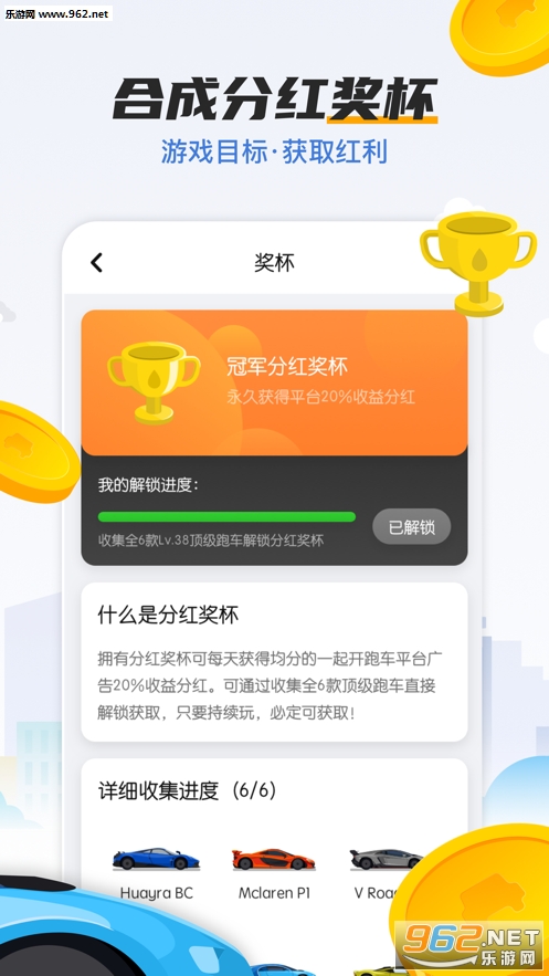 3、通过低等级的跑车不断的合成,获取更高等级的跑车,每天合成更可以获得分红奖杯。