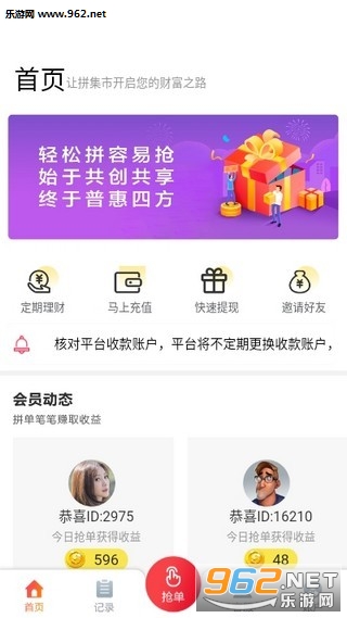 拼集市是一款抢单赚钱的软件,大家可以在这里轻松获得抢单任务,完成之后就能获得手艺,兼职会员佣金最高千分之三,每个账户每日最高可抢108单,有需要的朋友快来下载吧。