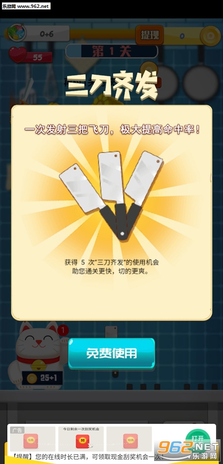 3、解决掉各种不同类型的关卡并获取你需要的各种奖励,解锁更多的刀具。