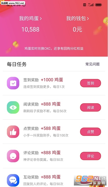 1.下载APP,新用户登录后赠送10000鸡蛋,10000鸡蛋=1元,每天评论、点赞、分享文章和做任务都可以获得鸡蛋奖励。