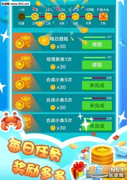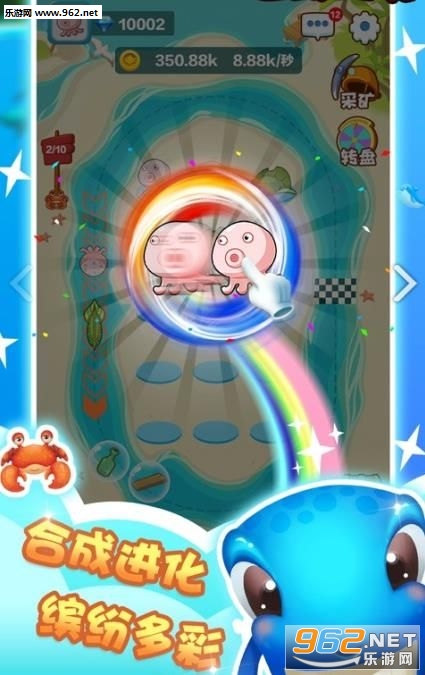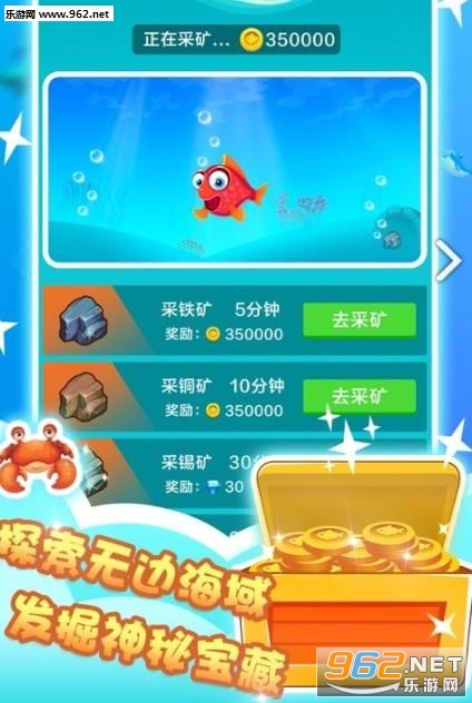 3、不断的合成使得你的鱼类们能够进化,通过N次的合成解锁出深海巨鲸,开启特殊宝藏。