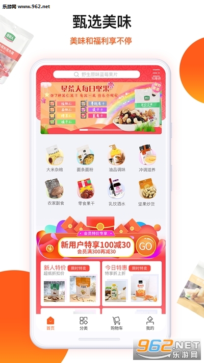 产品种类覆盖大米杂粮、油品调料、乳饮酒水、农家副食、面条面粉、零食果干、冲调滋养、坚果炒货等,一站购齐。