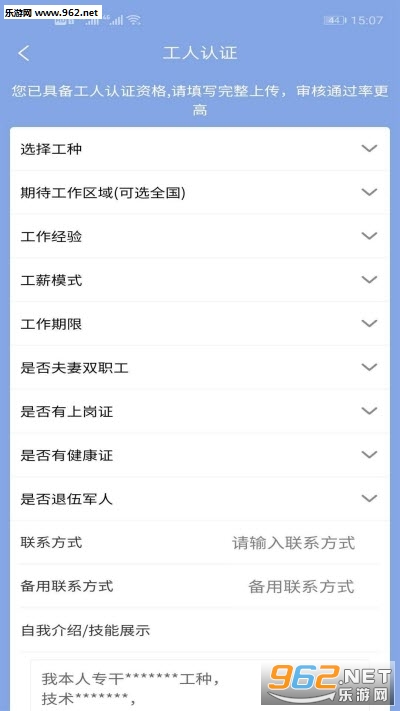 工人找活:发布自定义找活信息,包含类型、区域、自我介绍等具体内容