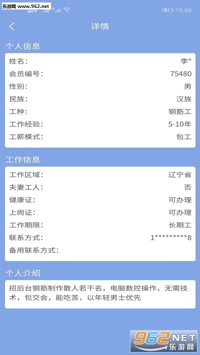 招工信息:发布自定义招工信息,包含工种、类型、人数等具体内容
