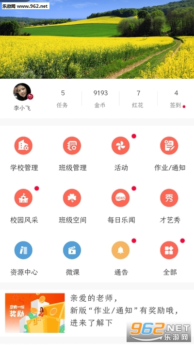 红花签到:老师可以根据学生表现发放红花奖励;家长和学生每日签到,增加班级人气的同时获得红星奖励。