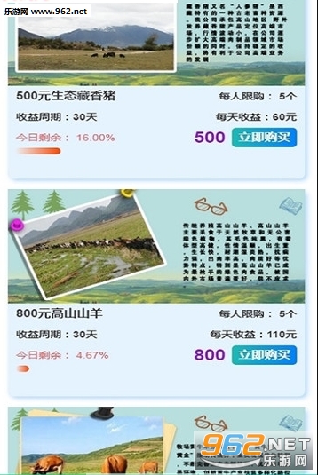 牧场黄牛每人限购: 5个收益周期:30天每天收益:220元今日剩余: 0.00%
