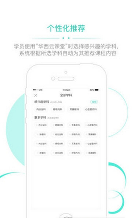 个性化推荐:学员使用“华西云课堂”时选择感兴趣的学科,系统根据所选学科自动为其推荐课程内容