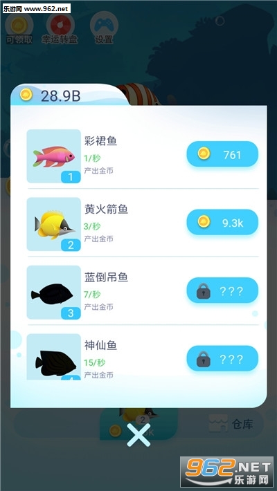 用户可以在应用中通过在线时间获取金币,使用金币购买和解锁不同等级鱼,每种鱼拥有自己的图鉴。