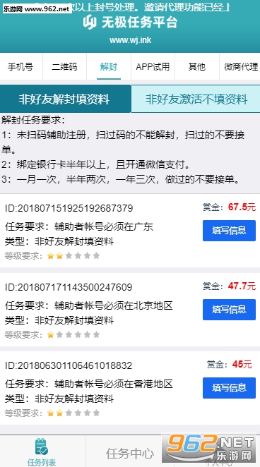 每20次可以放弃5次,超5次会限制10分钟禁止接任务,不能做任务的请放弃,每天系统会自动限制当天成功率低于%25的账户24小时(4条任务必须成功一条)请找好人扫码再接任务。接了任务请认真反馈任务状态,不真实的反馈会导致账户被系统封号.如有做成功的任务被商家判走失败,请上传任务成功的载图进行丰诉,恶意申诉会导致封号。