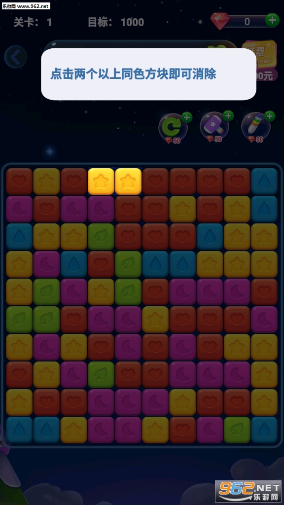操作简单一秒上手!滑动手指让三个及以上的相同星星横竖相连即可消除,完成每关的消除目标即可过关!