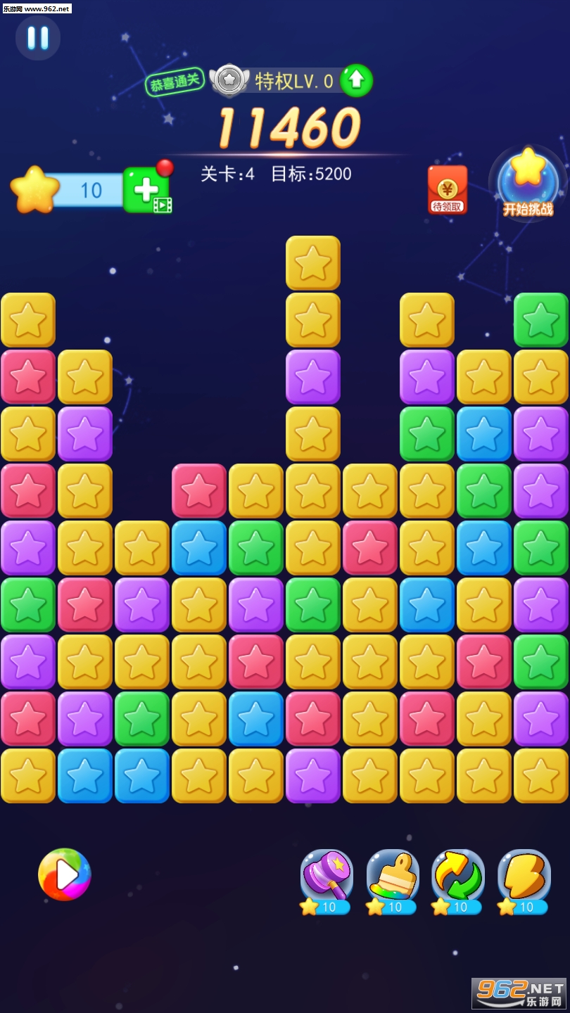 3、越多的星星一次性消除,你将会获得额外的分数加成。
