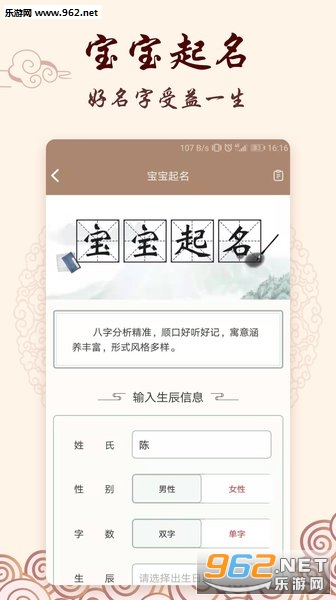 《起名生辰取名官方版APP》是以生辰为标准才测算卜名的软件,其可以测算新生宝宝的一生运势,然后结合命理来给宝宝取一个吉祥好名字,让宝宝一生安康,好运不断。
