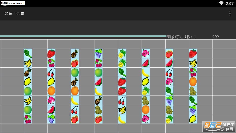 果蔬连连看,它以水果蔬菜为主题的连连看类型的小游戏,樱桃、香蕉、橙子、菠萝、草莓、西瓜等,这么多好吃的让我们一同消灭掉!游戏帮助:分别点击相同的两个图标,如果连接这两个图标的直线不超过三条,并且不能碰到其他图标,则消除图标,直到最终将图片全部消除。