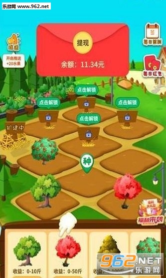 《农场果园红包版》是一款结合了玩游戏与赚红包于一体的手机游戏,丰富的大农场将给予你一场欢呼的娱乐气息,赶紧来这里感受一下种植果园的乐趣,同时还能认识不同的蔬菜水果,了解一系列的从生根发芽到蔬菜水果,没每一个细节来感受呀的成长趣味。