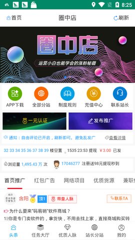 圈店,又名圈中店,是一款可以免费发布任务的平台,平台内可以做任务,抢红包,阅读资讯等,我觉得如果没有人脉的,又想推广赚钱的小伙伴值得试试。