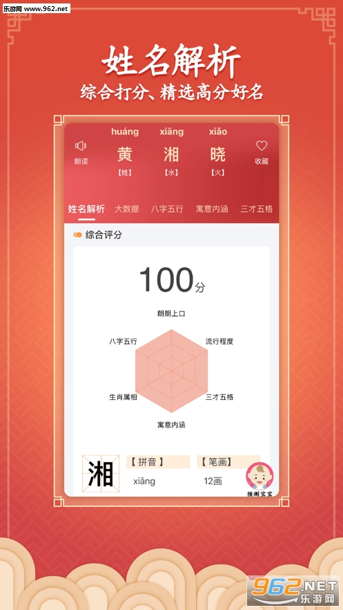 金宝贝取名软件支持自动分析生辰八字、自动做到命局的五行平衡、自动采用原版康熙字典的笔画、自动分析属性命理、自动采用字义美好的汉字、自动做到五格三才的完美配置、自动采用五行为吉的常用汉字、自动做到生态、事态、心态、同步平衡和谐发展、自动结合具有卓越成就的名人、名字用字、自动结合成语、唐诗、宋词起名、一键生成98分-100分的最佳名字(让用户选到满意为止),让宝宝轻松拥有一个陪伴一生的美名吉名。