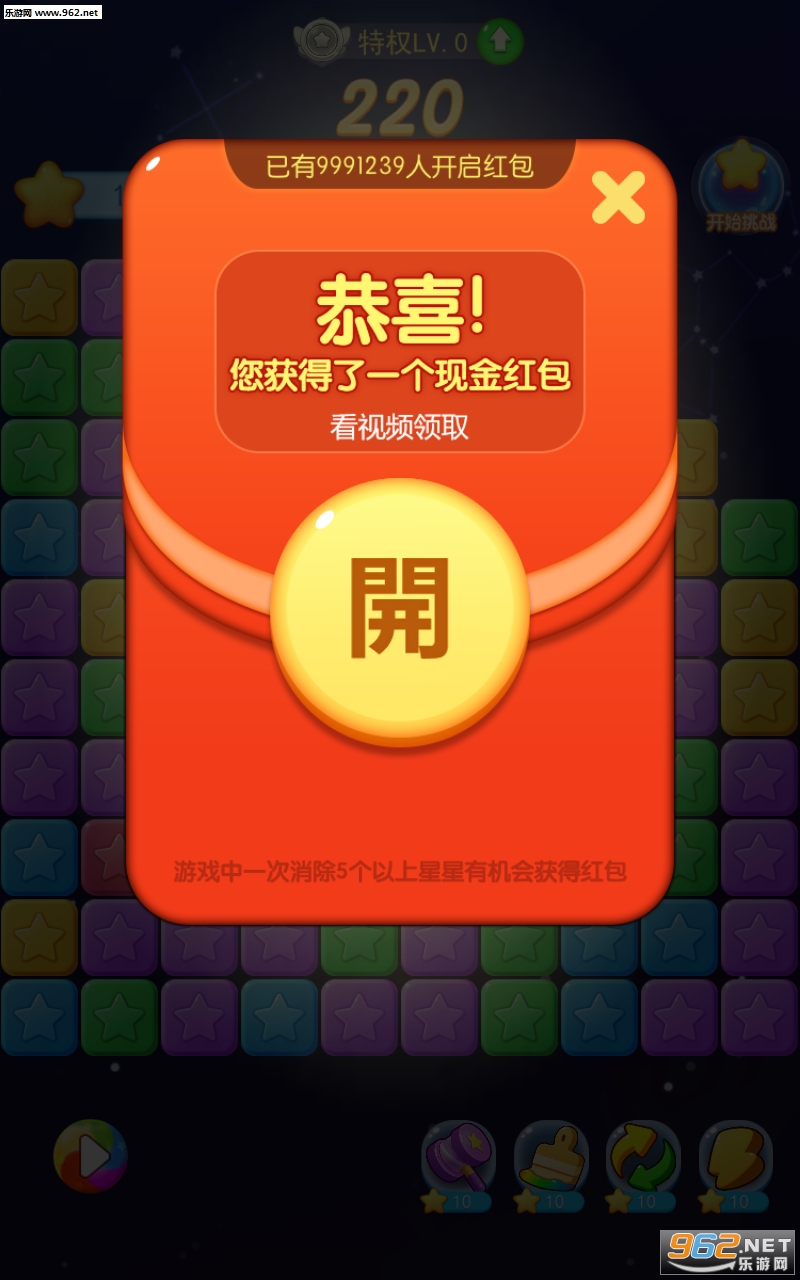爱玩消星星赚钱版是一款真实可以提现的消除类小游戏,在爱玩消星星赚钱版这款游戏中,适合所有的年龄段的玩家玩,非常的简单,玩家一只手就可以操作的哦,超多的游戏关卡等着玩家来解锁的哦,还可以领取红包。