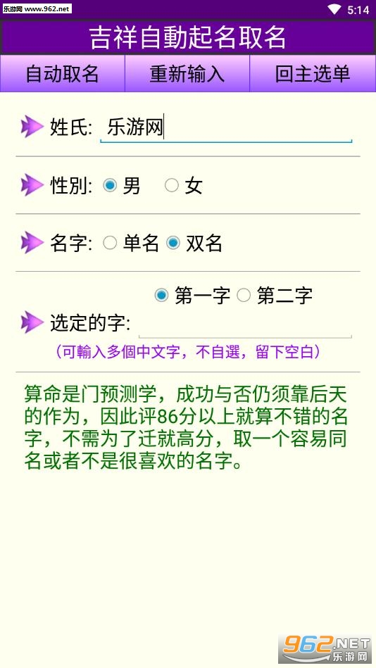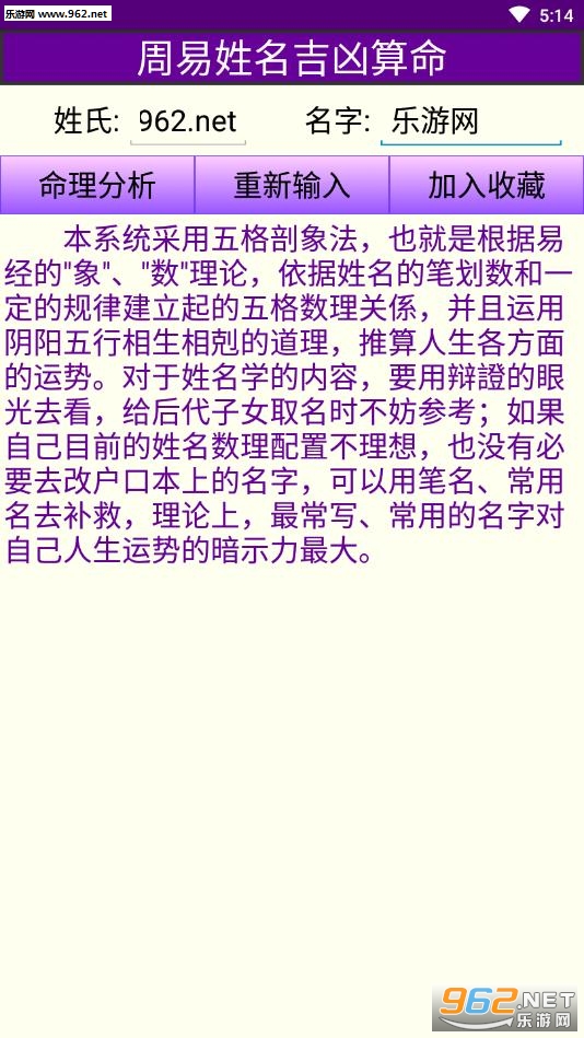 本程式繁、简体均适用,分为五大部分: 1.吉祥起名 2.周易姓名五格吉凶算命 3.称骨算命 4.姓名笔画说明 5.万年历(新历-农历)。