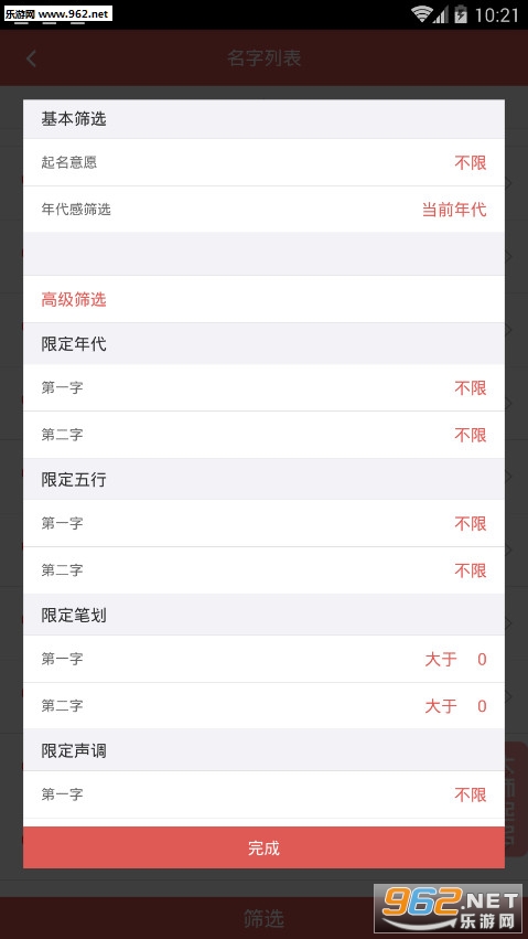 2. 高级筛选—限定汉字、限定笔画、限定五行、限定偏旁,年代感等,让起名不在难,好名字轻松起。