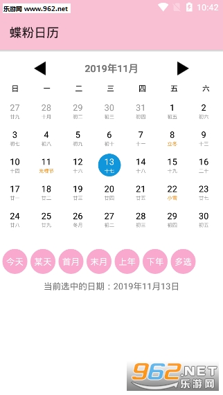 蝶粉日历具有所有传统日历的功能还还发出来了一些新的功能,具有首月末月的跳转还能够查询某一天,让人们不用一页一页的去翻转日历。
