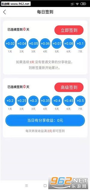 2、每日签到分为普通签到和高级签到,都能获得现金奖励